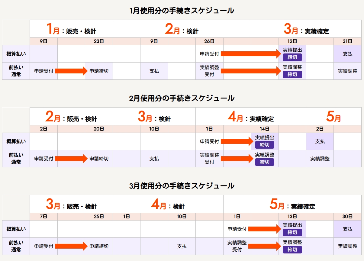 ただし、年始の検針を年末に繰り上げたることが特例として定められている場合は、2月検針分(1月使用分)に年末の使用分が含まれる場合でも、年末の使用分も含めて1月使用分として値引き支援の対象とできます。